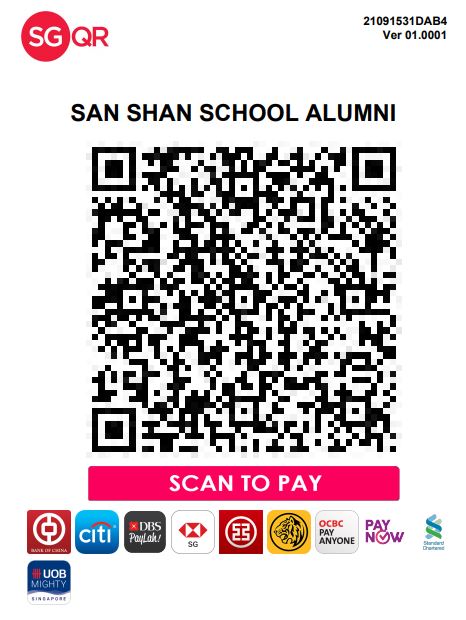 三山校友会正在筹募2021年活动基金, 希望同学们慷慨解囊, 请用手机PayNow/PayLah扫描这SGQR二维码在线上乐捐(最少$10), 谢谢大家的支持!