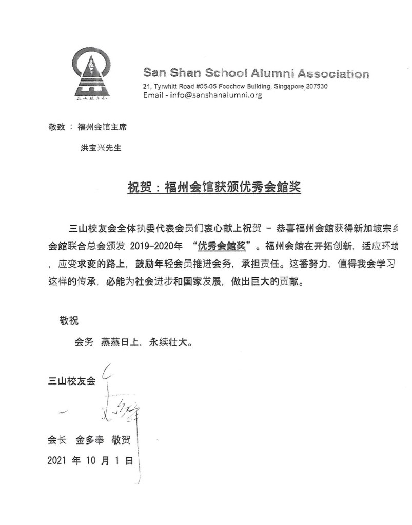 October 3, 2021October 5, 2021San Shan School Alumni, Singapore - 新加坡三山校友会Leave a Comment on 2021/10/01 恭贺福州会馆荣获优秀会馆奖 2021/10/01 恭贺福州会馆荣获优秀会馆奖 三山校友会恭贺福州会馆荣获新加坡宗乡会馆联合总会颁发2019-2020年度优秀会馆奖。 Share this: Share on Facebook (Opens in new window) Facebook Share on WhatsApp (Opens in new window) WhatsApp Share on LinkedIn (Opens in new window) LinkedIn Like Loading... Related
