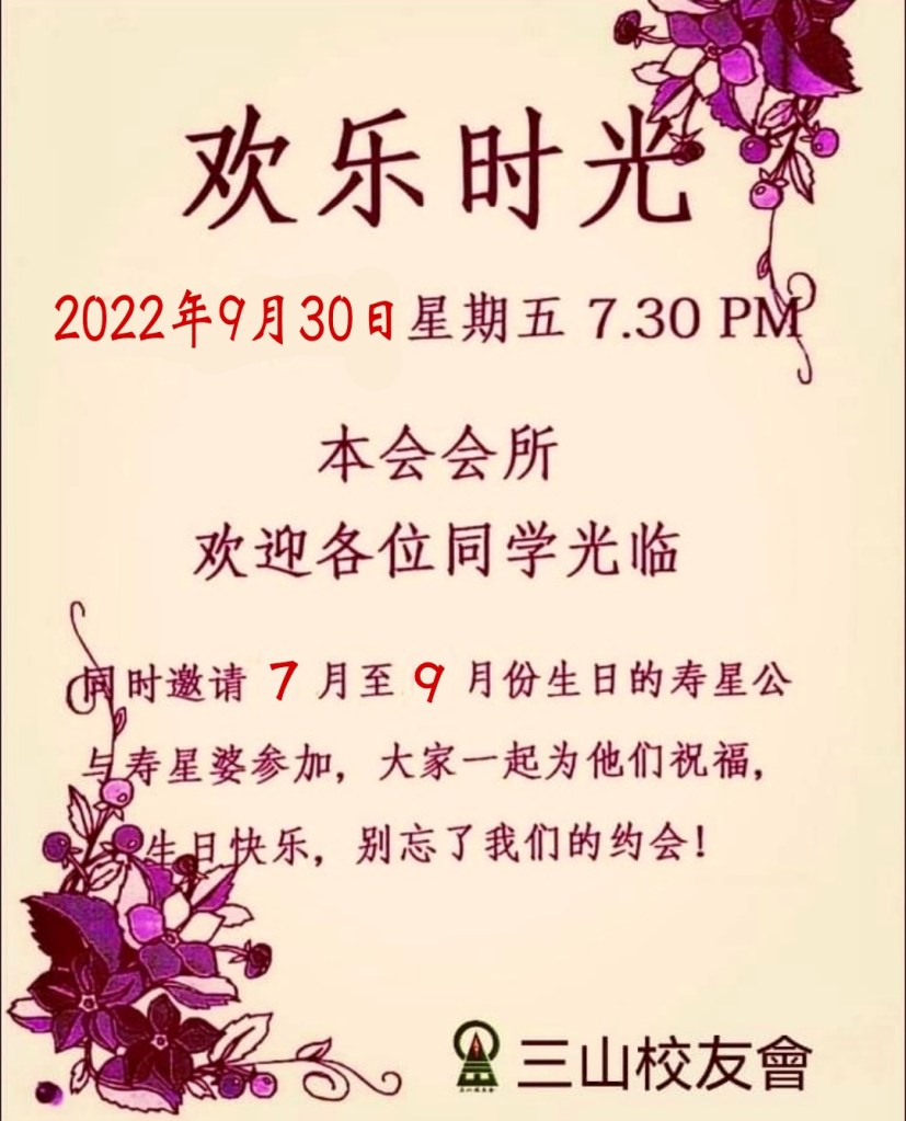 September 11, 2022September 11, 2022San Shan School Alumni, Singapore - 新加坡三山校友会Leave a Comment on 2022/09/10 欢乐时光 Happy Hour 2022/09/10 欢乐时光 Happy Hour #三山校友会 “欢乐时光” 2022年9月30日(星期五) 7.30PM 在本会会所:Foochow Building, #05-00Tyrwhitt Rd, S207539欢迎各位同学校友光临, 同时邀请7月至9月份生日的同学校友参加,大家一起为他们祝福 。你也可以带些食物和大家分享。详情联络程玉英同学: 93522215 详情参阅:三山脸书 San Shan Alumni Facebook Share this: Share on Facebook (Opens in new window) Facebook Share on WhatsApp (Opens in new window) WhatsApp Share on LinkedIn (Opens in new window) LinkedIn Like Loading... Related