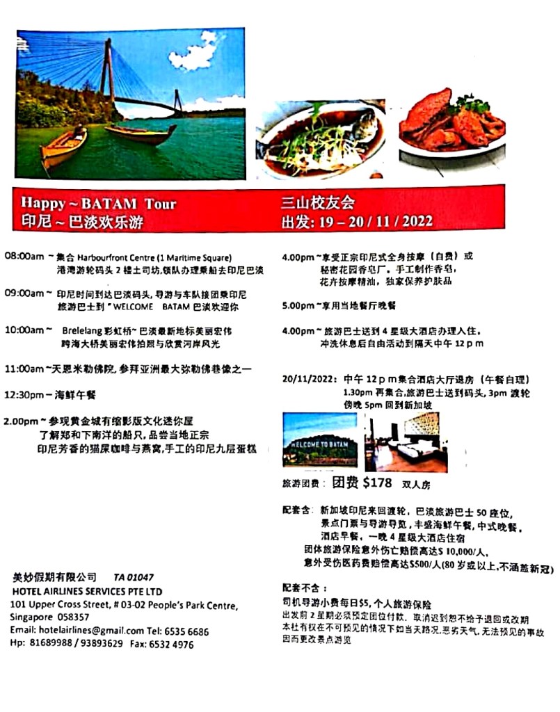 组织与康乐股将于11月19日至20日举办二日一夜巴淡欢乐游,节目包括丰盛海鲜午餐、中式晚餐、酒店早餐,游览巴谈地标-宏伟的彩虹桥,参观手工制作九层蛋糕,秘密花园香皂厂,独家保养护肤品等等,品尝当地正宗芳香的猫屎咖啡与燕窝,享受印尼式的全身按摩,住宿是四星级酒店,团费包括来回渡輪酒店三餐旅游巴士导游门票等,详情可见以上海报,凡有兴趣参加者可向以下负责人联络或在这平台上报名。