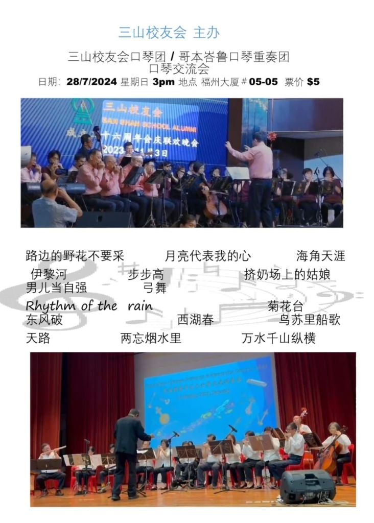 三山校友会与哥本峇鲁口琴奏团交流会, 日期:28/7/2024(星期日), 时间:3 pm, 地点:福州大厦5楼#05-05, 票价:$5/-