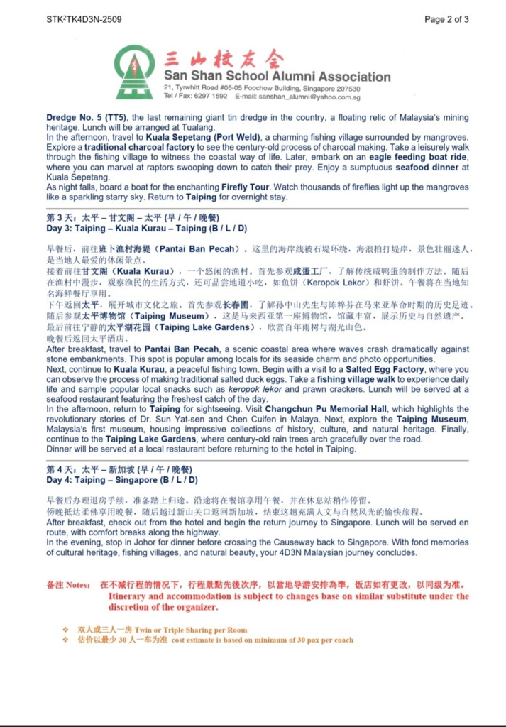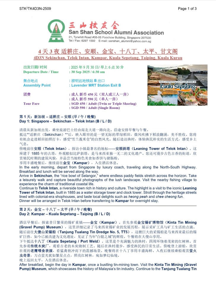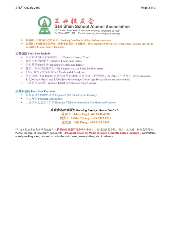 校友会将于9月30-10月3日举办四天三夜适耕庄、十八丁游,仅收30名额,细节如附件,有意参加者请尽快报名, 请联系:陈女士(HP:9738 4028); 程女士(HP: 9352 2215);张先生(HP:81610348)