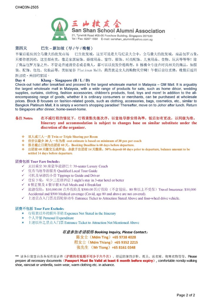 三山校友会将于5月26日-29日举办四日三夜金马伦巴生游,欢迎大家报名参加,只限30位,先到先得。有意参加者请联络:陈女士(HP:9738 4028); 程女士(HP: 9352 2215);张先生(HP:81610348)