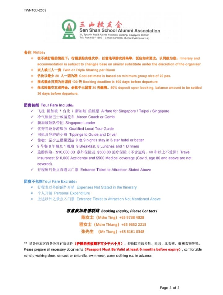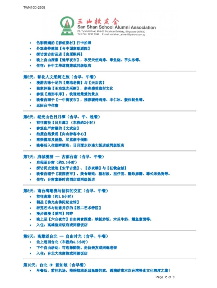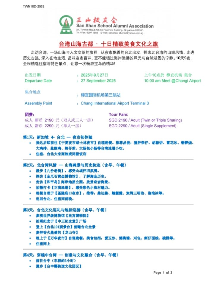 #三山校友会 主办台湾山海古都 十日精致美食文化之旅, 日期27/9 至开始接受报名,有意者请尽快报名, 请联系:陈女士(HP:9738 4028); 程女士(HP: 9352 2215);张先生(HP:81610348