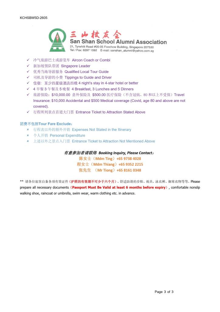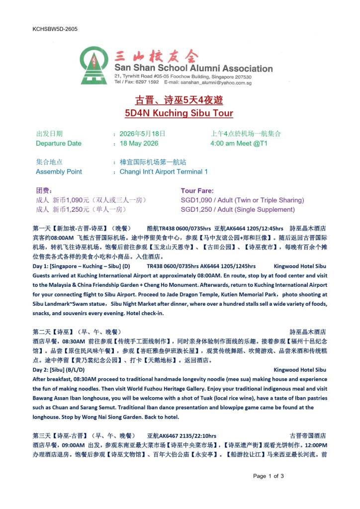 校友会康乐股将于18/5-22/5/26主办5天4夜古晋、诗巫遊,由于两躺的机票较难定,有意思参加的同学,请于二月底前报名, 有兴趣的同学、会员请联络:程玉英(HP: 9352 2215);陈秀萍(HP: 9738 4028);张先生(HP: 8161 0348)