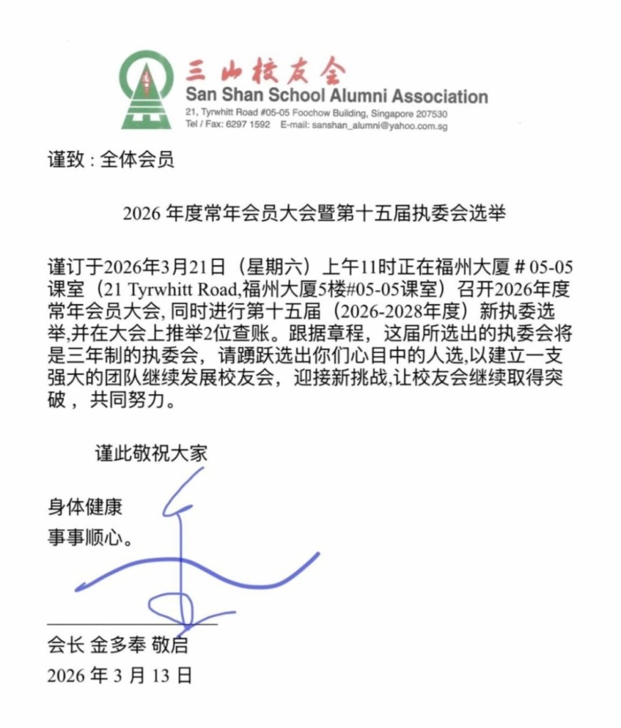 March 13, 2026March 13, 2026San Shan School Alumni, Singapore - 新加坡三山校友会Leave a Comment on 2026/03/21 2026年度常年会员大会暨第15届执委会选举 2026/03/21 2026年度常年会员大会暨第15届执委会选举 Share this: Share on Facebook (Opens in new window) Facebook Share on WhatsApp (Opens in new window) WhatsApp Share on LinkedIn (Opens in new window) LinkedIn Like Loading... Related