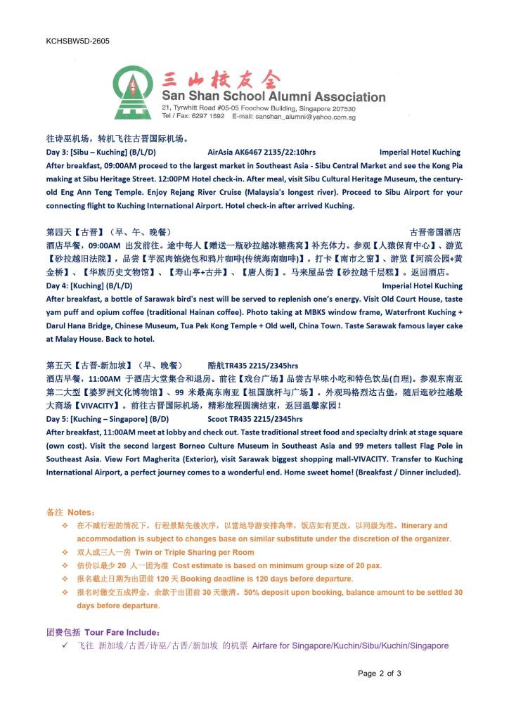 校友会康乐股将于18/5-22/5/26主办5天4夜古晋、诗巫遊,由于两躺的机票较难定,有意思参加的同学,请于二月底前报名, 有兴趣的同学、会员请联络:程玉英(HP: 9352 2215);陈秀萍(HP: 9738 4028);张先生(HP: 8161 0348)